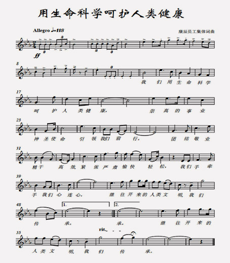 《用生命科学呵护人类健康》是企业识别系统CI体系重要的声音识别,集中体现了康辰公司的企业文化的理念和内涵。成为康辰弘扬康辰文化,在第一时间增强客户沟通和形象展示的“声音名片”。2010年底,康辰司歌由康辰全员集体创作而成。在创作初稿时,歌词部分请著名词作家帮助修正两个词语。在旋律上,则采用激昂的进行曲,词曲搭配,形成具有独特个性的,也是这个时代所特有的坚强、有力、短促的旋律和节奏。康辰司歌的合唱编配、乐队配器、总指挥由中国人民解放军军乐团乐队总指挥于建芳协助完成,他也是中国历史上第一位在港指挥中国国歌的中国人。中国人民解放军军乐团演奏,中国人民解放军总政歌舞团合唱。整个司歌豪迈、激昂、大气、恢宏。表达了康辰人的追求卓越、勇往直前的精神。